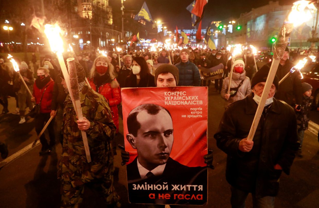 La cosa empezó a torcerse cuando los manifestantes que atacaban a la policía iban uniformados paramilitarmente y empezaron a aparecer símbolos nazis en sus escudos. Algo empezaba a oler mal. La bandera rojinegra resultó ser el símbolo del ejército insurgente ucraniano del nazi Stepan Bandera, que se alió a los nazis alemanes en la Segunda Guerra Mundial, llevando acabo matanzas de sus compatriotas ucranianos judíos, que llegaron a escandalizar a los propios alemanes.