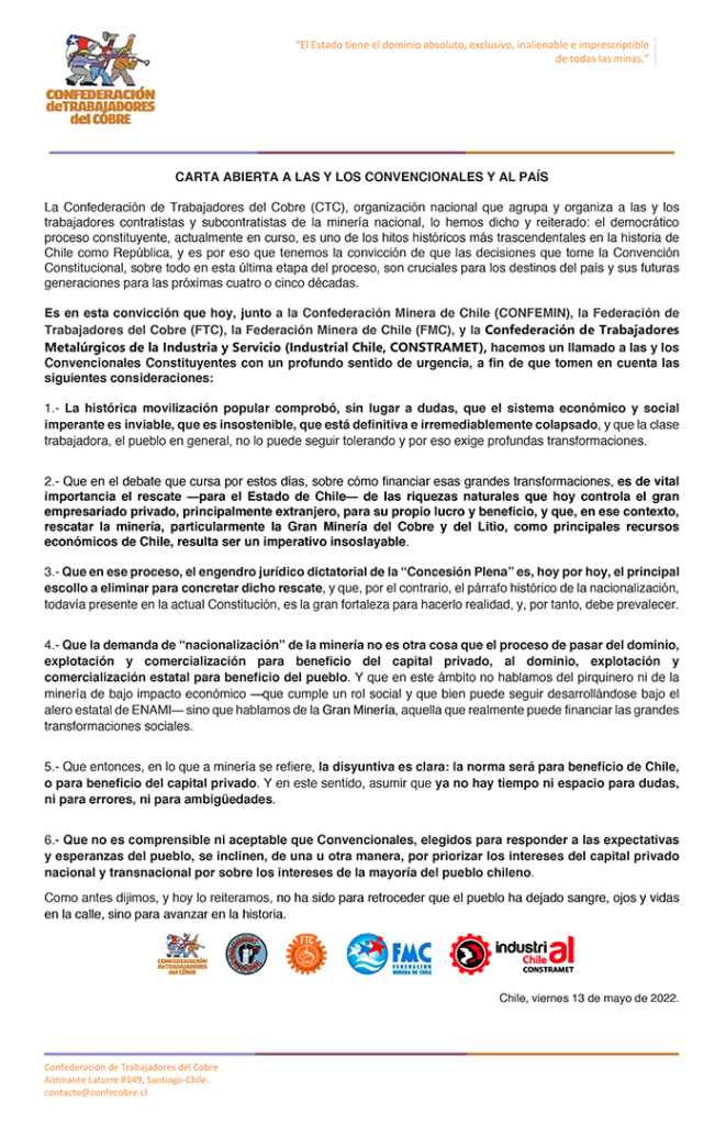 Es en esta convicción que hoy, junto a la Confederación Minera de Chile (CONFEMIN), la Federación de Trabajadores del Cobre (FTC), la Federación Minera de Chile (FMC), y la Confederación de Trabajadores Metalúrgicos de la Industria y Servicio (Industrial Chile, CONSTRAMET),hacemos un llamado a las y los Convencionales Constituyentes con un profundo sentido de urgencia, a fin de que tomen en cuenta las siguientes consideraciones: