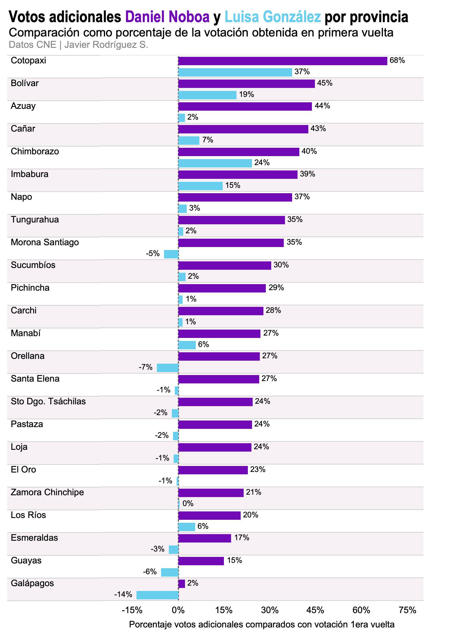 En aquella oportunidad el actual presidente y candidato a la reelección, Daniel Noboa, logró el 44,17 por ciento, lo que equivale a 4 millones 527 mil 606 votos, mientras que González obtuvo el 44 por ciento, que equivale a 4 millones 510 mil 860 sufragios.
