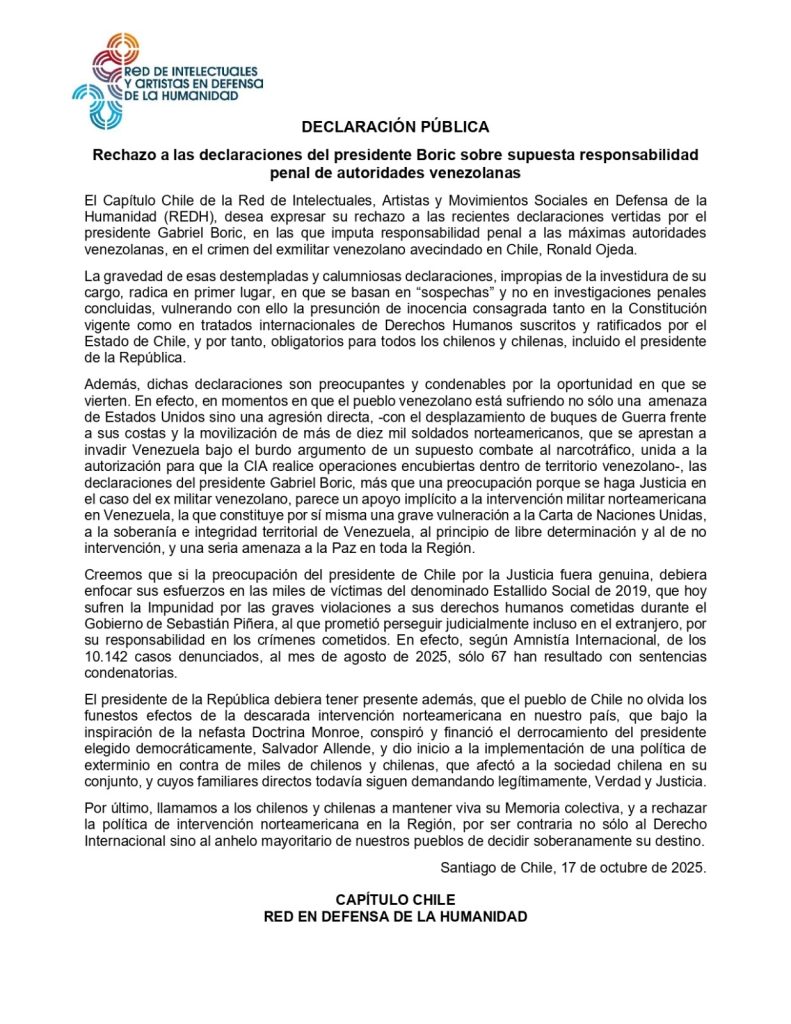 El Capítulo Chile de la Red de Intelectuales, Artistas y Movimientos Sociales en Defensa de la Humanidad (REDH), desea expresar su rechazo a las recientes declaraciones vertidas por el presidente Gabriel Boric, en las que imputa responsabilidad penal a las máximas autoridades venezolanas, en el crimen del exmilitar venezolano avecindado en Chile, Ronald Ojeda.