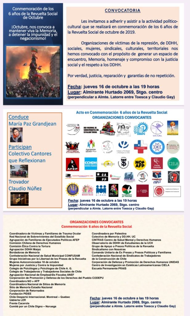 Más de 40 organizaciones de DDHH., de víctimas de la represión, del ámbito sindical y social convocaron el pasado jueves 16 de octubre a conmemorar los 6 años de la Revuelta popular de octubre. Con el propósito firme de mantener viva la Memoria como un acto de resistencia y reafirmar el compromiso prioritario de continuar exigiendo justicia por las violaciones a DDHH, detener la impunidad y el negacionismo que se ha instalado en el país.